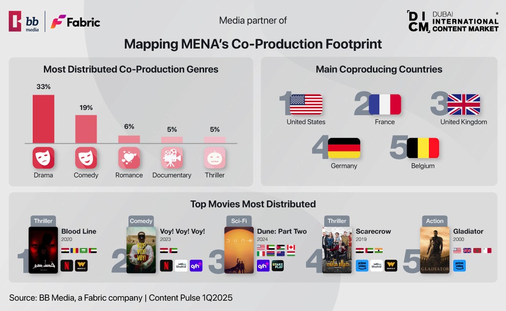 تشير التحليلات إلى أن الولايات المتحدة وفرنسا والمملكة المتحدة وألمانيا وبلجيكا تُعد من أكثر الدول تعاونًا مع بلدان الشرق الأوسط وشمال إفريقيا في مجال الإنتاج المشترك. وتبرز أهمية هذا التعاون في المشاريع الضخمة التي تجمع بين مواقع التصوير في المنطقة والتوزيع العالمي.